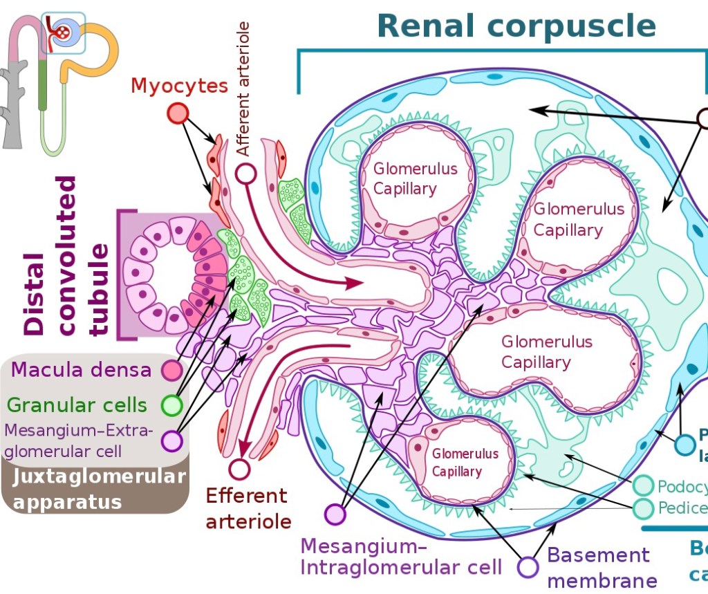 The liver produces a plasma protein called angiotensinogen. We will come back to angiotensinogen in a second. Our kidneys produce an enzyme called Renin. Renin is produced by a structure called the juxtaglomerular apparatus. Which is only a small portion of a much larger structure responsible for filtration of the blood.